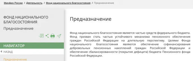 Изначально Фонд Национального Благосостояния создавался с целью софинансирования пенсионной системы. Это напрямую прописано в бюджетном кодексе, а сайт минфина до сих пор указывает для фонда именно такое предназначение.