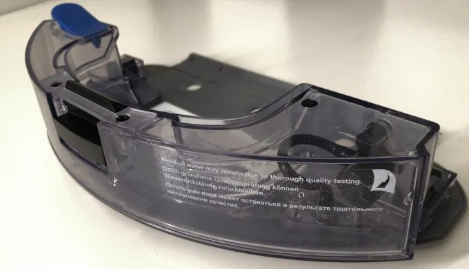 Чтобы начать влажную уборку, нужно установить в передний отсек робота специальный контейнер с водой, на который насаживается салфетка из микрофибры. В отличие от конкурентов, где используется примитивная капельная система, Deebot использует водяной насос для подачи жидкости на микрофибру. Это делается для равномерной подачи воды и возможности контролировать интенсивность в приложении.
