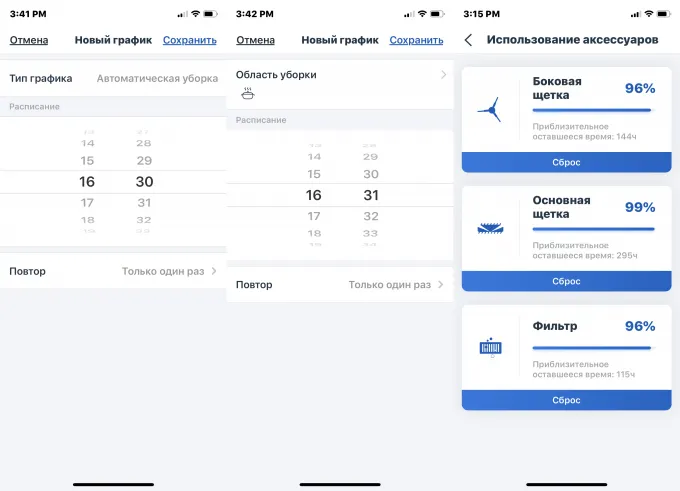 В приложении вы можете не только начать уборку вручную, но еще и составить график уборки. Причем необязательно каждый день убирать всю квартиру – зональную уборку по графику пылесос тоже поддерживает.