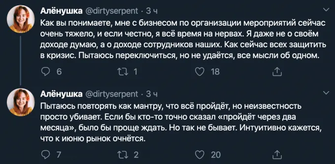 Параллельно тётя заметила, что скоро ей придётся строже контролировать свои финансы. Алёнушка работает в ивент-индустрии, которая очевидно сильно страдает из-за карантина и пандемии.