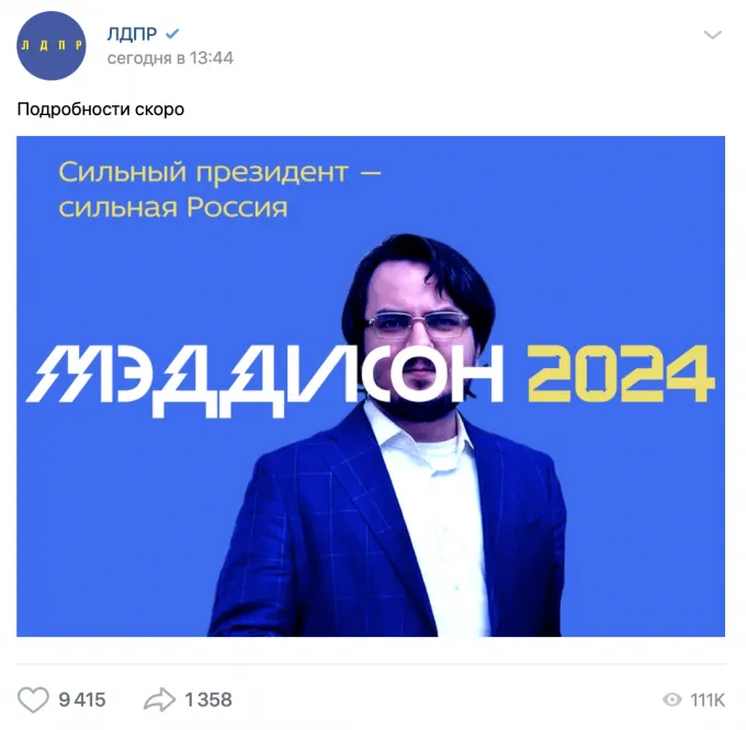 «Мэддисон 2024» и «Сильный президент – сильная Россия» – панчлайны розыгрыша либерально-демократической партии. Пост стал вирусным: к концу дня он собрал 111 тысяч просмотров, почти 10 тысяч лайков и около 1,4 тысяч репостов.