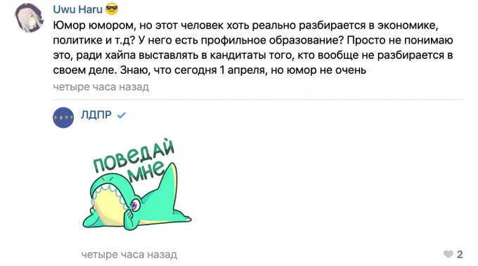 Кто-то не понял иронии или не узнал нового кандидата – администратор паблика постарался доходчиво объяснить. Отдельно был затронут национальный вопрос – исторически один из основных в повестке ЛДПР.
