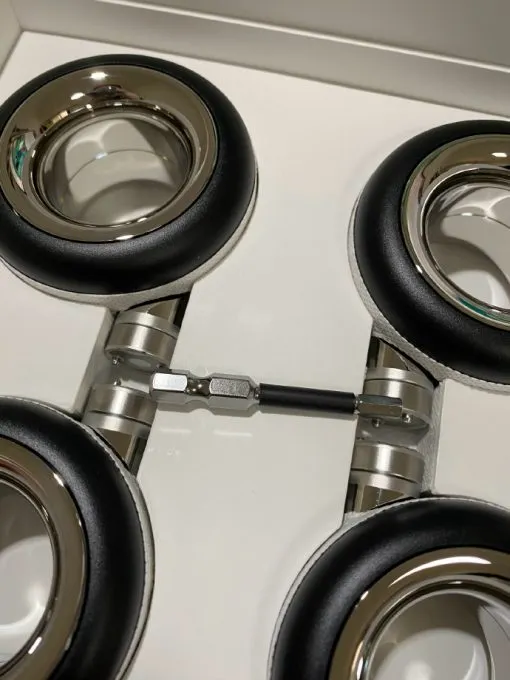 Покупатель получает обычную белую коробку из плотного картона с рисунком колеса. Внутри находятся четыре элемента, прикрытые картонкой. Колеса изготовлена из металла с глянцевой текстурой, они имеют прорезиненные «шины».
