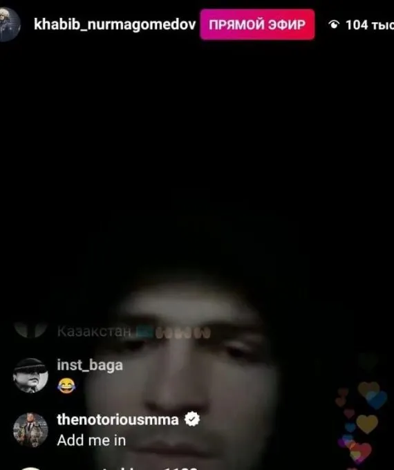 Во время эфира Хабиба в инсте в комментариях неожиданно появился Конор и написал: «Добавь меня». Однако дагестанец отказался от предложения продолжить трансляцию вдвоем, попрощался с фолловерами и закончил эфир.