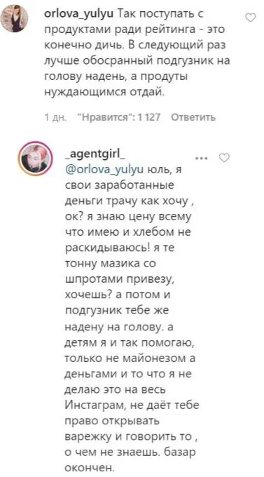 Одной из таких борцушек за социальную справедливость Настя даже ответила. Дамочка обвинила Ивлееву в том, что она переводит продукты в такое сложное время – «Лучше отдай нуждающимся». О да, видите эти толпы людей, умирающих от недостатка шпротов и майонеза? Вот что ответила Ивлеева.