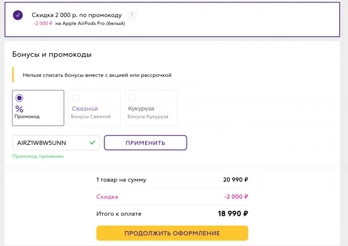 Для покупки «прошек» по сниженной цене нужно зайти на страницу товара в «Связном», бросить аксессуар в корзину и поставить галочку напротив акции «скидка 2000 рублей по промокоду». Вуаля – можете забирать AirPods Pro за 18 990 рублей.