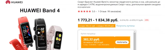 Как получить скидку? Надо всего лишь взять нужный купон продавца прямо на странице товара, пример на скрине ниже. При оформлении заказа скидка будет применена автоматически. И упомянем про ещё один приятный нюанс — товар отмечен шильдиком «Plus». А это значит, что гаджет вам доставят быстро и курьером до двери.