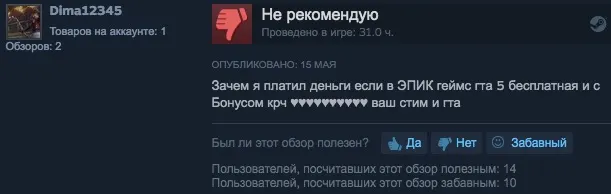 Акцию проводит только Epic Games Store: например, другая площадка для цифровой дистрибуции игр — Steam — все еще продает игру по полной стоимости. Это крайне разозлило геймеров, купивших GTA V в Steam за — страшно подумать — 1499 рублей. Люди бросились писать гневные отзывы, обвиняя компанию в заговоре и требуя вернуть деньги в качестве моральной компенсации.