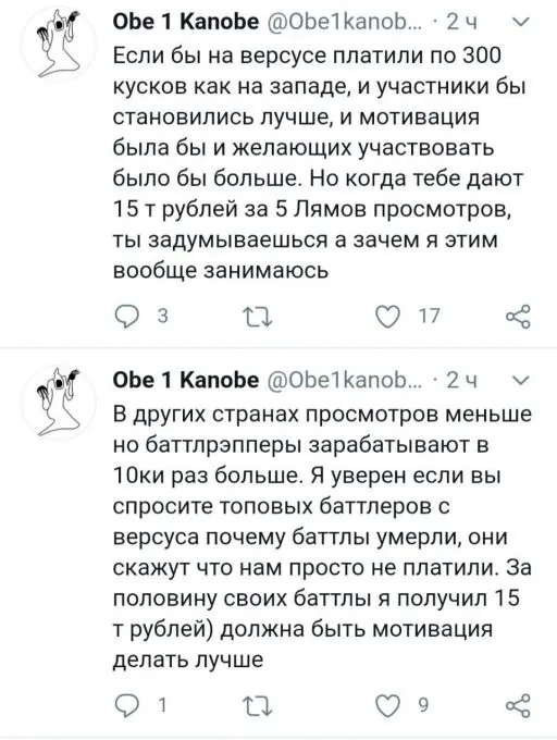 Теперь же Оби Ван сделал неожиданный выпад в адрес «Версуса». Он утверждает, что батлы в «1703» затухли из-за того, что организаторы слишком мало платили участникам, не оценивая их талант должным образом. Вот как звучит его претензия.