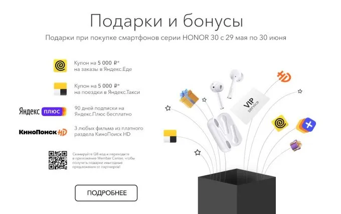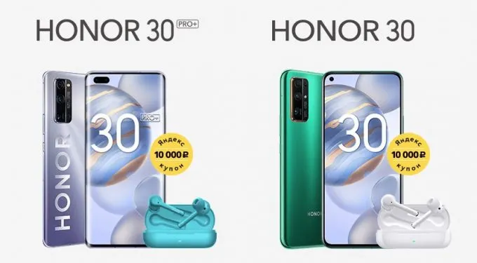 Базовая «тридцатка» обойдется в 34 990 рублей, Honor 30 Pro+ оценен в 54 990 рублей. При покупке в подарок к обоим девайсам дадут TWS-наушники Honor Magic EarBuds и бандл от «Яндекса» на сумму 10 000 рублей. В него входит купон на 5000 рублей в «Яндекс.Еде» и еще один купон на аналогичную сумму в «Яндекс.Такси» — жрать и кататься!