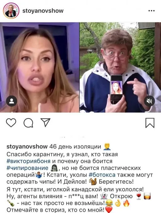 Очередной выпуск он начал как раз со стёба над Викторией Боней, записав видеомануал о том, как искать проклятый чип в ботоксных губах. Этот же момент артист продублировал в инстаграм. Эмоджи, конечно, жуткие, но человеку всё-таки 62 года – так что укол засчитываем.