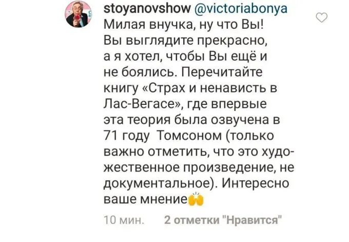 Лучше посмотрим, как отреагировал Стоянов. Беззлобно и красиво. Порекомендовал почитать Хантера Томпсона и получше разобраться в мировых заговорах. Круто, что дядечка в состоянии спокойно дебатировать с сумасшедшими.