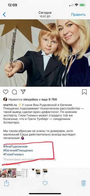 На следующий день Яна снова вышла в онлайн, заметив, что не может отойти от этой истории. Дама поразилась циничности издания, которое опубликовало свою заметку в инстаграм и отметило главных героев — Рудковскую, Гном Гномыча и его отца Евгения Плющенко. Возможно, Яна немного напутала — издание действительно поставило хэштеги имен членов звездной семьи, но не отмечало профили Евгения, Яну и Гномыча. Впрочем, сейчас это проверить невозможно — инстаграм StarHit закрылся.
