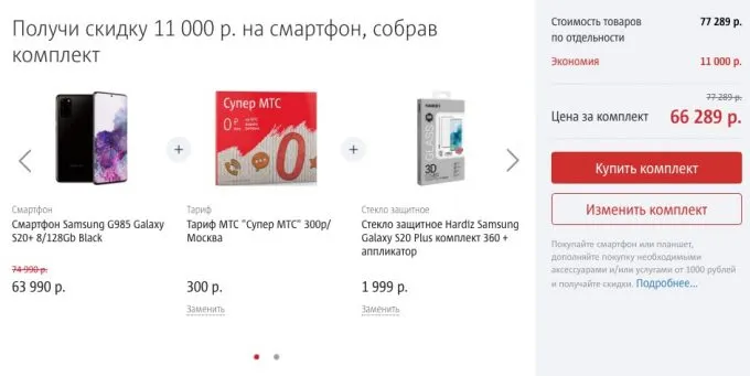 Оператор предлагает скинуть 11 000 рублей от стоимости плюсового флагмана. Galaxy S20+ (8/128 Гбайт) обойдется вам в 66 289 рублей, если вы положите в корзину немного аксессуаров — например, вот таких: