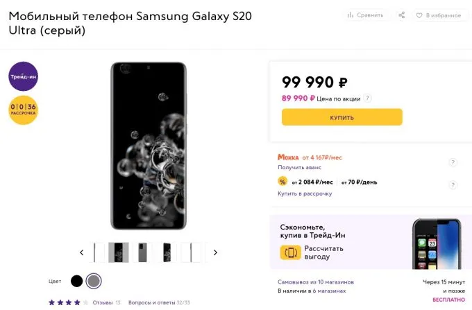 - Galaxy S20 Ultra — 89 990 вместо 99 990 рублей