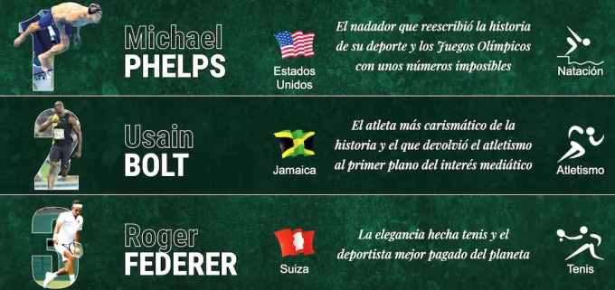 На втором месте оказался самый быстрый человек планеты, спринтер из Ямайки Усейн Болт. На третьем — швейцарский теннисист Роджер Федерер. Интересно, что своего соотечественника и вечного соперника Федерера Рафаэля Надаля испанская газета поставила на четвертое место.