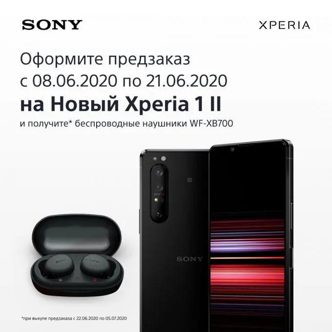 Если оформить предзаказ на смартфон в период с 8 по 21 июня, то Sony подарит наушники-вкладыши WF-XB700. Отдельно беспроводная гарнитура стоит 9990 рублей (не путать с накладными WH-XB700 за 6,3К рублей). Девайс нужно будет выкупить до 5 июля.