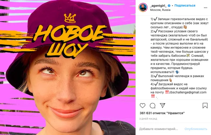 Настя просит фэнов присылать сложные, небанальные, а главное, авторские задания. Молю вас, подписчики, дайте популярной тете хоть немного уникальности: она и так поглощает сгнившие форматы. И это заметно.