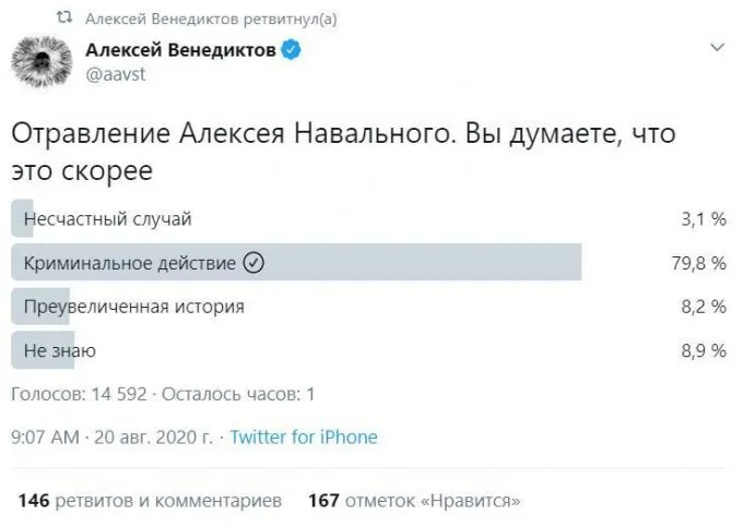 После госпитализации Навального главный редактор «Эха Москвы» Алексей Венедиктов создал в твиттере максимально травоядный опрос.
