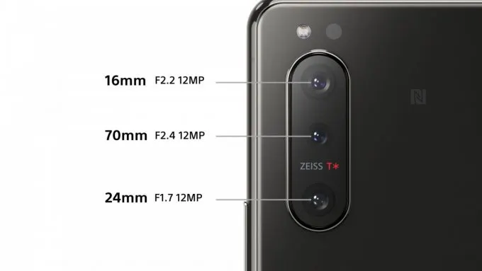 Сзади расположена тройная камера с широкоугольным и ультраширокоугольным объективами и телевиком разрешением 12 мегапикселей каждый. Xperia 5 II умеет записывать 4К-видео частотой до 120 fps.