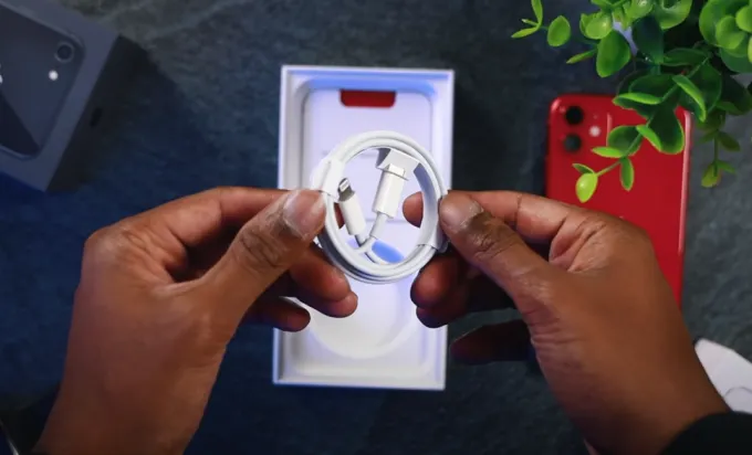 Внутри блогер нашел только смартфон и провод USB-C-Lightning.