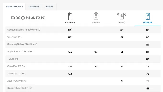 Первое место в топе занял Samsung Galaxy Note 20 Ultra, который получил 89 баллов. На втором и третьем местах оказались OnePlus 8 Pro (88) и Samsung Galaxy S20 Ultra (87). Топовый iPhone 11 Pro Max разместился лишь на четвертой позиции, получив 84 балла.