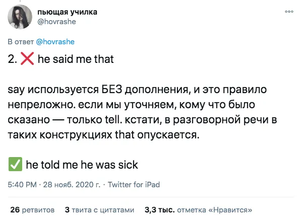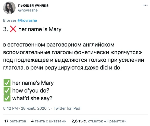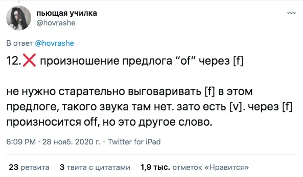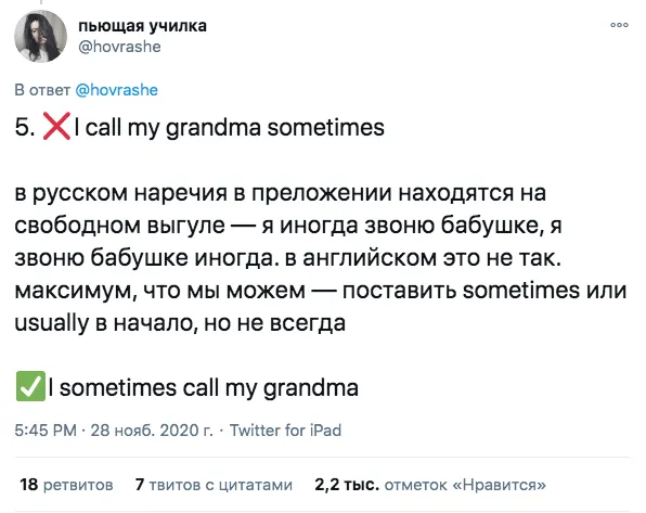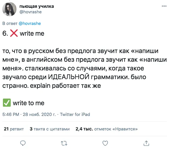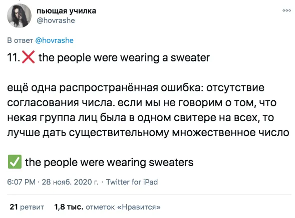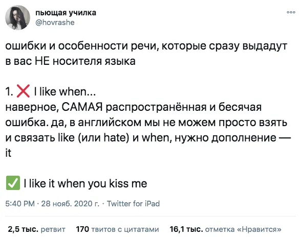 В твиттере стал вирусным тред блогерши Пьющей Училки. Она рассказала о 12 типичных ошибках во фразах и выражениях. Их делают люди, которые не говорят на английском, но пытаются выучить язык.