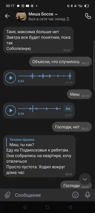«Максим Мунхоев жив. Это оказался перфоманс. Перфоманс, стоивший мне седых волос. Максим Мунхоев, Леша Ляшенко и Миша Босов, я вас очень люблю, правда. Но идите на*** просто. В голосовых Миша рассказывает, как ребята ходили опознавать тело и что Максим точно мертв», – написала Щукина в твиттере, прикрепив к посту скриншот переписки с Мишей Босовым (тоже комиком).