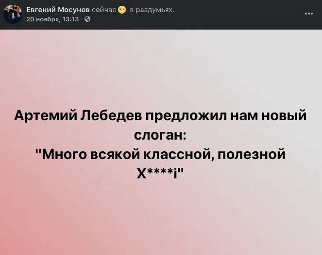 Судя по реплаям Мосунова, компания не заказывала слоган у Темы — видимо, идея родилась у Артемия внезапно. Также пиарщик отметил, что Лебедев недавно похвалил корпорацию.