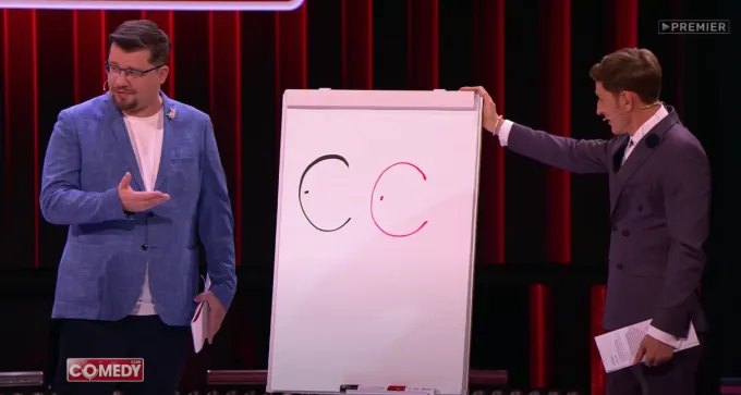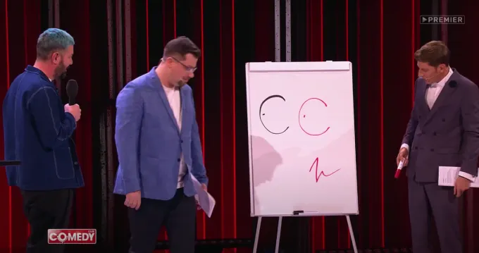 Дизайнер и блогер Артемий Лебедев пришел в гости к Comedy Club. Резиденты шоу Харламов и Воля попросили Тему нарисовать логотип — Лебедев не отказался.
