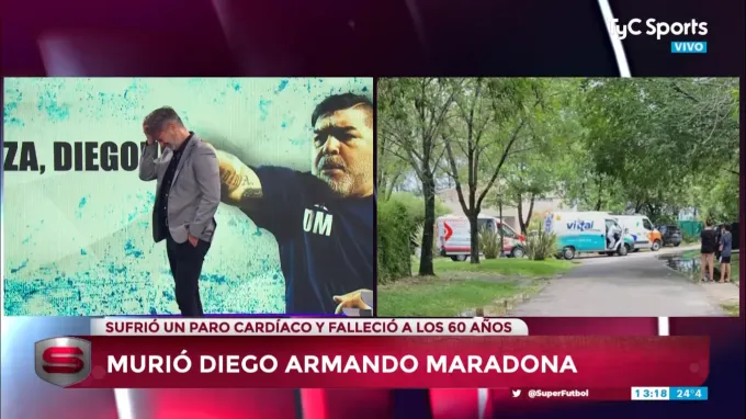 Одним из первых подтверждение смерти Марадоны получил аргентинский телеканал TyC Sports. В студии находился ведущий Диего Диас, а в прямой эфир приходили многочисленные сообщения об уходе Диего Армандо из жизни. «Невозможно быть готовым ко всему, – начал Диас. – Мы здесь, как и вы у себя дома [пауза], думали, что сейчас посмотрим кино, почитаем какую-то книжку и не…»