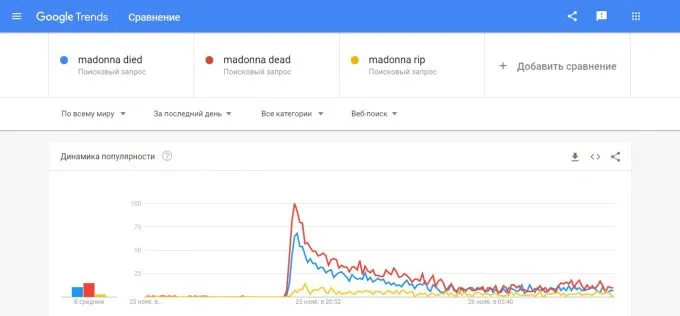 В статистике Google Trends видно, как волнообразно двигались поисковые запросы – сначала резкий взлет в районе 19:40 по московскому времени и плавное падение буквально в течение часа. Причем по продвинутым метрикам заметно, что чаще информацию о смерти Мадонны искали как раз в США, Канаде и Австралии.