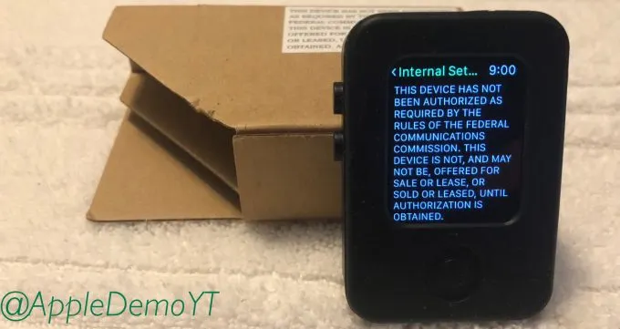 Часы помещены в защитный кейс, но разглядеть устройство гаджета все равно можно. Аксессуар имеет прямоугольный корпус с цветным экраном и две физические кнопки сбоку. На экране можно увидеть предупреждение, что этот девайс не сертифицирован FCC — то есть аппарат находится в стадии прототипа и не предназначен для продажи в США.