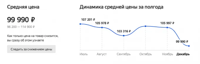 Средняя стоимость iPhone 11 Pro Max с накопителем на 256 Гбайт на Маркете составляет ровно 100 тысяч рублей. Но если зайти в раздел «Цены» и раскидать прайсы от меньшего к большему, то получится минимальная цена в 96 200 рублей.