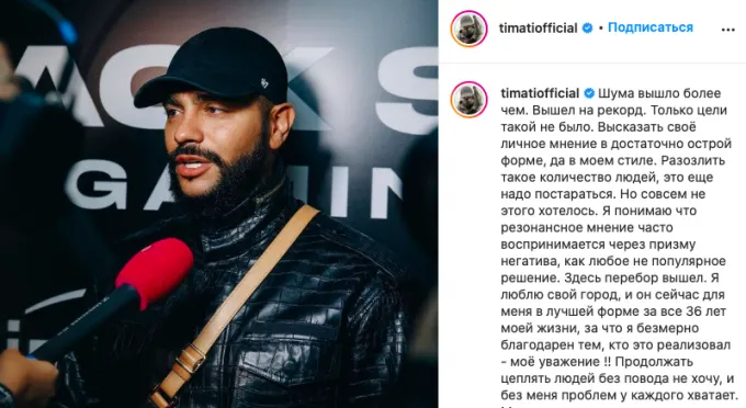 Ильдарович побежал в инсту. Заявил, что больше не хочет злить русский народ, и убрал за собой. Официальная причина: удалил, чтобы «не продолжать волну негатива». В комментариях к посту Тимати отметил, что ему совсем не стыдно, денег не заносили, а Собянина он уважает и без проплаченных клипов. Гуф, в свою очередь, делал то, что умеет лучше всего: нес несвязный бред и путался в показаниях.