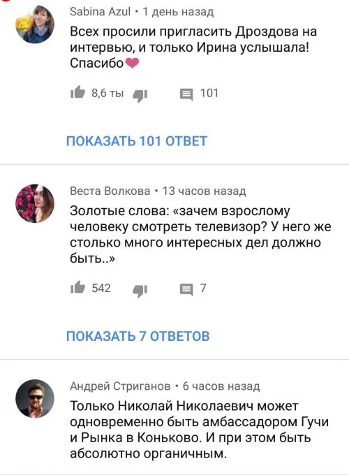 За всё интервью Шихман с Дроздовым не было ни одной резонирующей темы, только задушевные рассуждения о мирском и вечном. Они бы ещё в пледы укутались, честное слово! Фанаты Николая Николаевича, признайтесь себе: вы не хотите узнавать что-то новое, вам просто нравится засыпать под этот голос.
