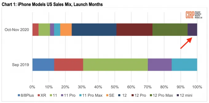 По данным CIRP, на iPhone 12 mini в США пришлось всего 6% от общей доли смартфонов Apple. Для сравнения, доля iPhone 12 составляет 27%: то есть каждым четвертым проданным айфоном в Америке является 6,1-дюймовый iPhone 12. Мы уже объясняли логику покупателей: логично доплатить 100 баксов и получить более крупный и презентабельный смартфон с лучшей автономностью.