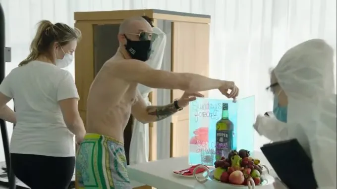 Также в комнате развесили воздушные шарики в цветах ирландского флага с привязанными к ним полароидными снимками Макгрегора. Прямо в номере есть спортзал и отдельная душевая кабина для бойца. Затем Конор обратил внимание на бутылку виски Proper Twelve, стоявшую на столе. «Это то, что надо, это мы откроем», – засмеялся экс-чемпион. «Тут еще и 1,75 литра! А почему в коробке-то?» – удивился он.