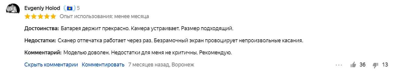 Есть ли у гаджета недостатки? Да, нашли два нюанса. Во-первых, некоторым юзерам может не хватать производительности из-за слабого чипсета MediaTek Helio P65. Во-вторых, владельцы жалуются на работу подэкранного сканера отпечатков — он медленный и не всегда распознает палец.