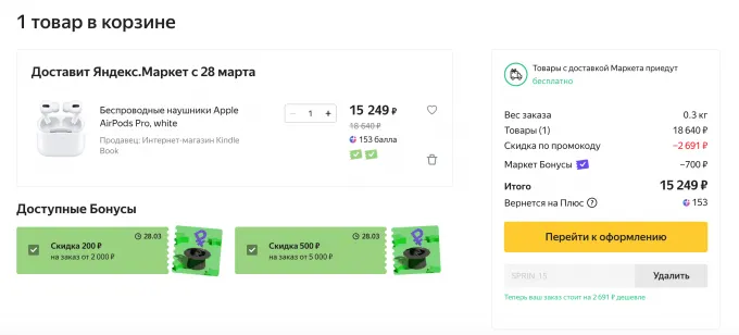 Беспроводная гарнитура оценена на Маркете в 18 640 рублей. Однако с весенним промокодом SPRIN_15 стоимость наушников составит 15 844 рублей. Обращаем внимание, что прайс может меняться, но незначительно.