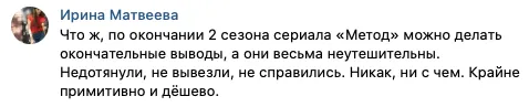 В итоге «Метод 2» оказался школьным тестом на тип личности. Лирики простят все косяки ради финальной улыбки Паулины Андреевой, а физики отметят сценарную убогость продолжения. Чтобы порадовать и тех и других, достаточно оставить уже поднадоевших героев в покое. Пусть отдыхают: на море, на солнце или в психушке уже не важно – главное, чтобы без третьего сезона.
