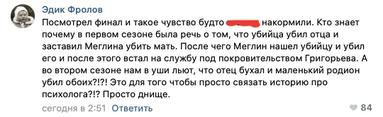 Но, несмотря на спорный сезон, финал поделил поклонников на два лагеря. Первые (их больше) плевались от личности главманьяка, отсутствия былой атмосферы, странной мотивации персонажей и обилия сценарных дыр. Даже хваленый «Ты меня не поймаешь» сделал все, чтобы его поймали.
