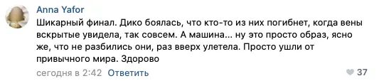 Вместо этого весь заключительный эпизод сценаристы сшивали ошметки сюжета в единое целое. Закончили хэппи-эндом: Есеня Стеклова и Родион Меглин сначала постановочно подрались, а после укатили на моря. И все бы хорошо, но в последнем кадре режиссер Войтинский наделил старую Волгу главных героев способностью летать. Видимо, ссылаясь на свой предыдущий фильм – «Черную молнию». Но не все зрители оценили фантастический финал более-менее реалистичного произведения.