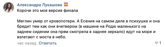 Кто-то увидел в этом метафору освобождения, а кто-то решил, что персонажи полетели искать заблудшую кукуху Есени. Еще один вариант: Меглин уныло помер, а вся концовка – либо его предсмертная выдумка, либо бредни обезумевшей Стекловой.