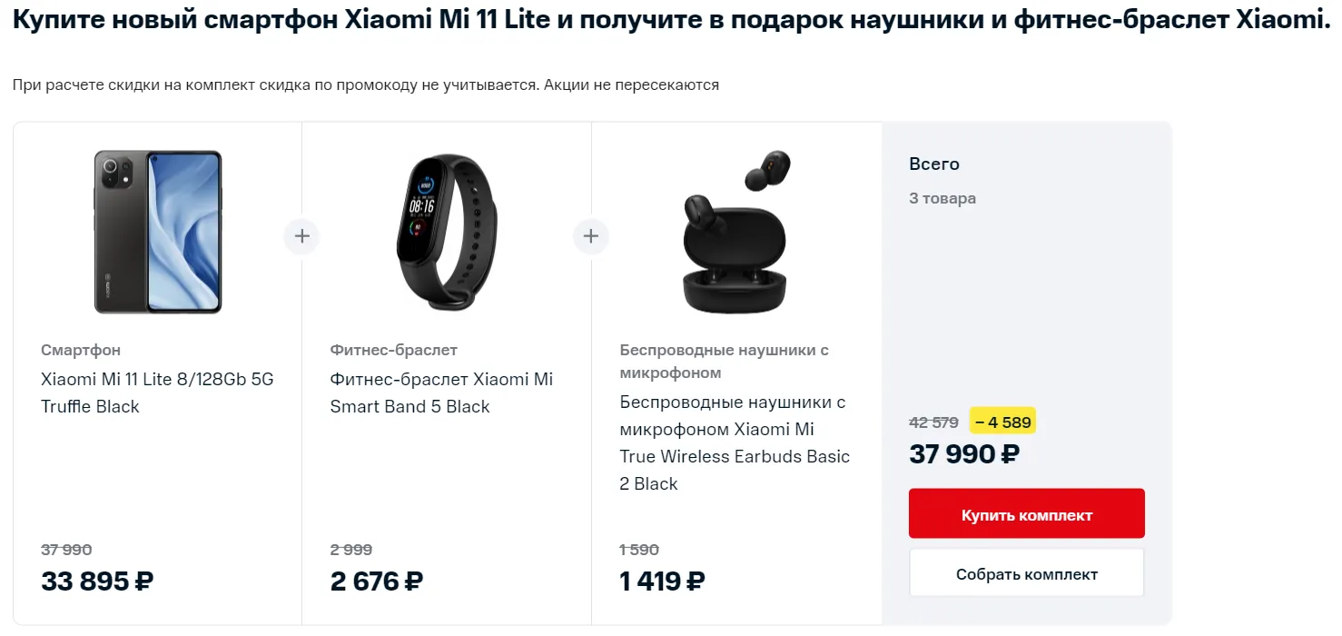Первый — взять у официалов. Например, при покупке в МТС вы можете получить в подарок фитнес-браслет Mi Band 5 и TWS-наушники EarBuds Basic 2. Для этого нужно всего лишь выбрать опцию «Купить комплект», как на скрине ниже. Если что, в М.Видео алгоритм тот же.