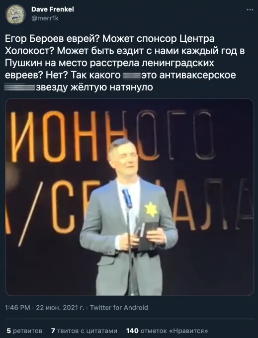 Актер из «Турецкого гамбита», «Территории» и «Перевала Дятлова» появился на сцене с наколотой на груди шестиконечной звездой. Это очевидная отсылка к маркировке евреев в гетто и концлагерях во время Второй мировой войны. «Я хочу вам сказать, что не вакцинировался от коронавируса. Но некоторые мои знакомые и друзья вакцинировались — это никогда не было причиной для споров и ссор», — начал Бероев.
