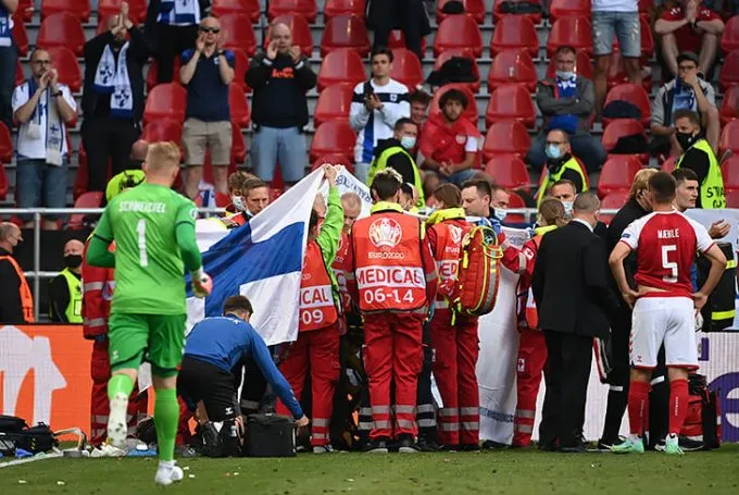 На поле выбежали врачи. Сообщается, что понадобился массаж сердца, пришлось даже использовать дефибриллятор. Чтобы заслонить Эриксена от камер журналистов, датчане взяли хавбека в кольцо. Затем игрока «Интера» вынесли с поля.