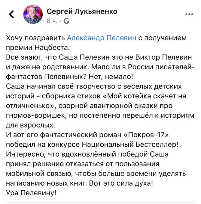 Сразу отметим, что это другой Пелевин — с Виктором автора книг «Калинова Яма», «Четверо», «Покров-17» очень часто путают. Теперь путаницы прибавится, так как у Виктора Олеговича тоже есть «Нацбест».