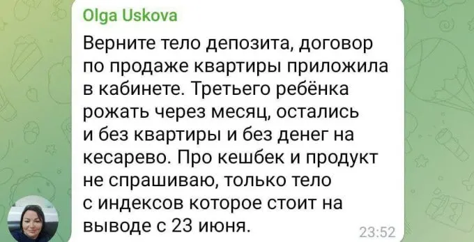 Ольга рассказала, что слила на «Финико» квартиру и все накопленные деньги. Даме скоро рожать, а средств на комфортные роды нет: