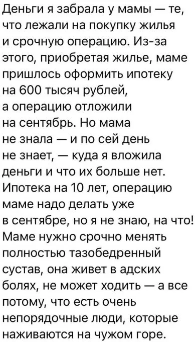 Встречаются и такие персонажи, которым очень сложно сочувствовать. Все потому, что из-за их глупости пострадали другие люди. Например, анонимная вкладчица забрала деньги у своей матери — те были отложены на операцию. Пожилая женщина страдает из-за проблем с суставами, операция намечена на сентябрь, но денег на хирургическое вмешательство уже нет: